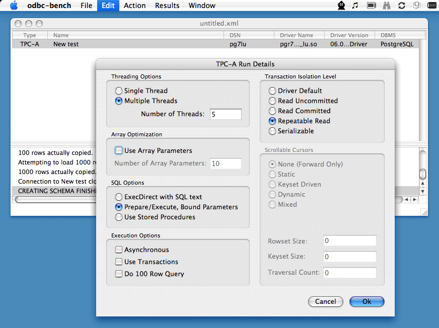 bash$ odbc-bench-cmd -d "pglocal" -u tim -p "" -D bash$ odbc-bench-cmd -d "pglocal" -u tim -p "" -C bash$ odbc-bench-cmd -d "pglocal" -u tim -p "" -r 1 -t 4 -s prepare \ -c keyset -S 5 -K 5 -v |& tee run.log