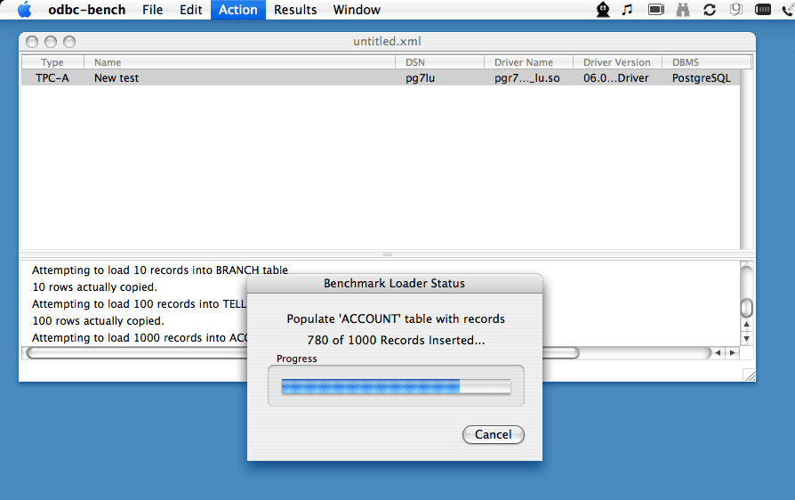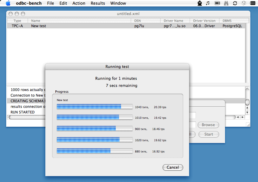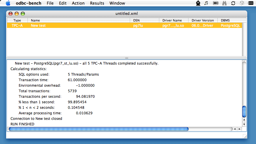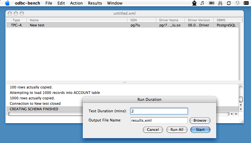 This section guides you through setting ODBC-Bench to connect to a datasource, configure a test and run it. You have the option of using the GTK or Carbon GUIs or running it all from the commandline.