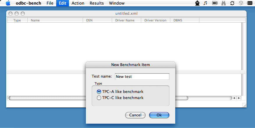From here, under the Edit menu, select `new benchmark item'. You can choose a name for the test-run, and whether it's to use the TPC-A or TPC-C model: